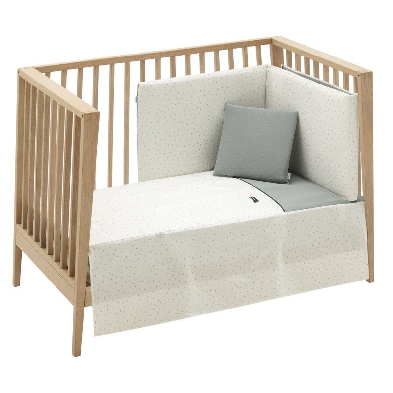 Juego de 2 piezas para vestir la cuna, compuesto por colcha invierno/verano más protector incluye un bonito cojín bordado. La colcha, es la prenda que viste la cuna y cumple el cometido de protección contra el frío como si de una manta o una funda nórdica se tratara. Su cualidad de tener un relleno desenfundable la convierte en una prenda versátil para ser utilizada en invierno y en verano y también ofrece la ventaja de ser lavada con facilidad. Dispone de 3 volantes que cumplen la función de vestir la cuna. El protector fabricado con tejido cuyo interior va acolchado con fibra hueca, amortigua los posibles golpes del bebe contra la cuna. Colcha - 60x120 cm Protector - 180x40x3 cm