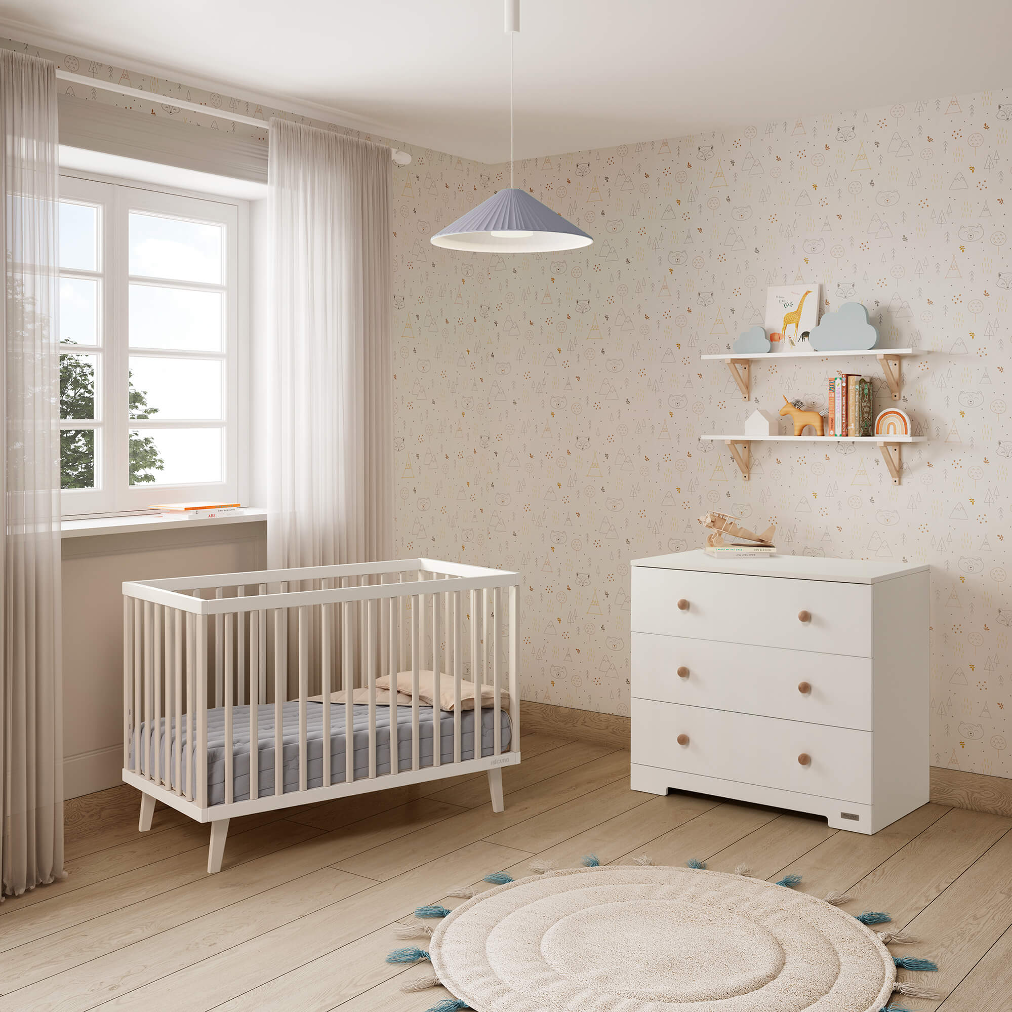 La cuna Mencía, de estética nórdica ,convertirá la estancia en un espacio acogedor y elegante.